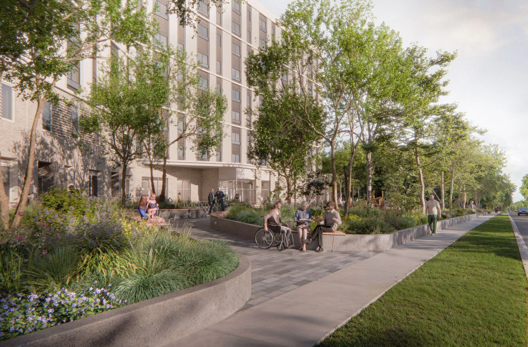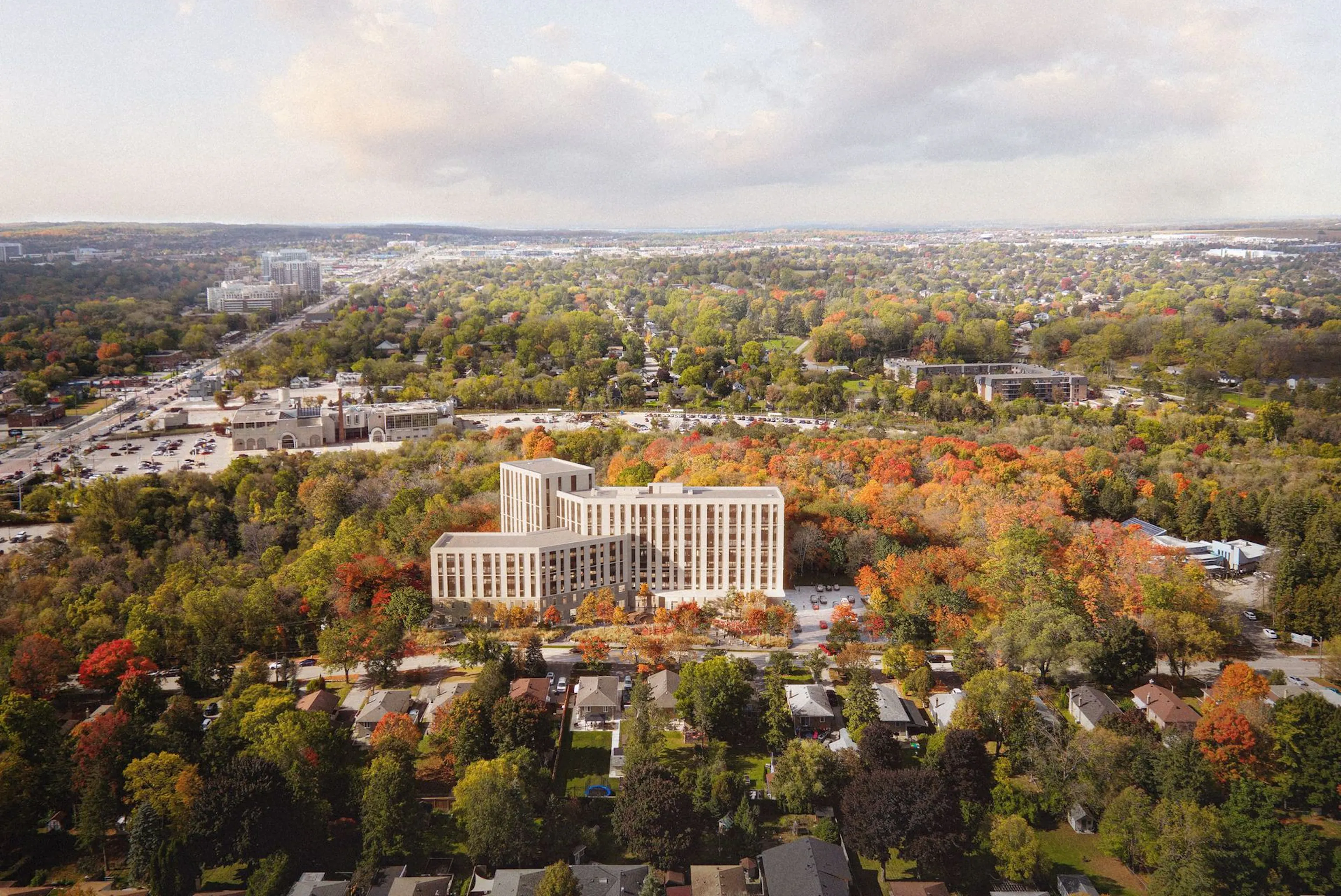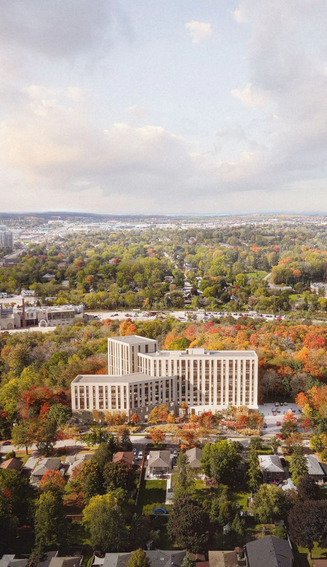 The building's generous setback from Bayview Parkway allows the adjacent conservation lands to reconnect, creating a continuous forested buffer. The large amenity deck extends into the landscape, while terraced gardens with raised beds encourage active participation and healthy living for all residents. A children's play area and community gathering spaces encourage connections between residents.