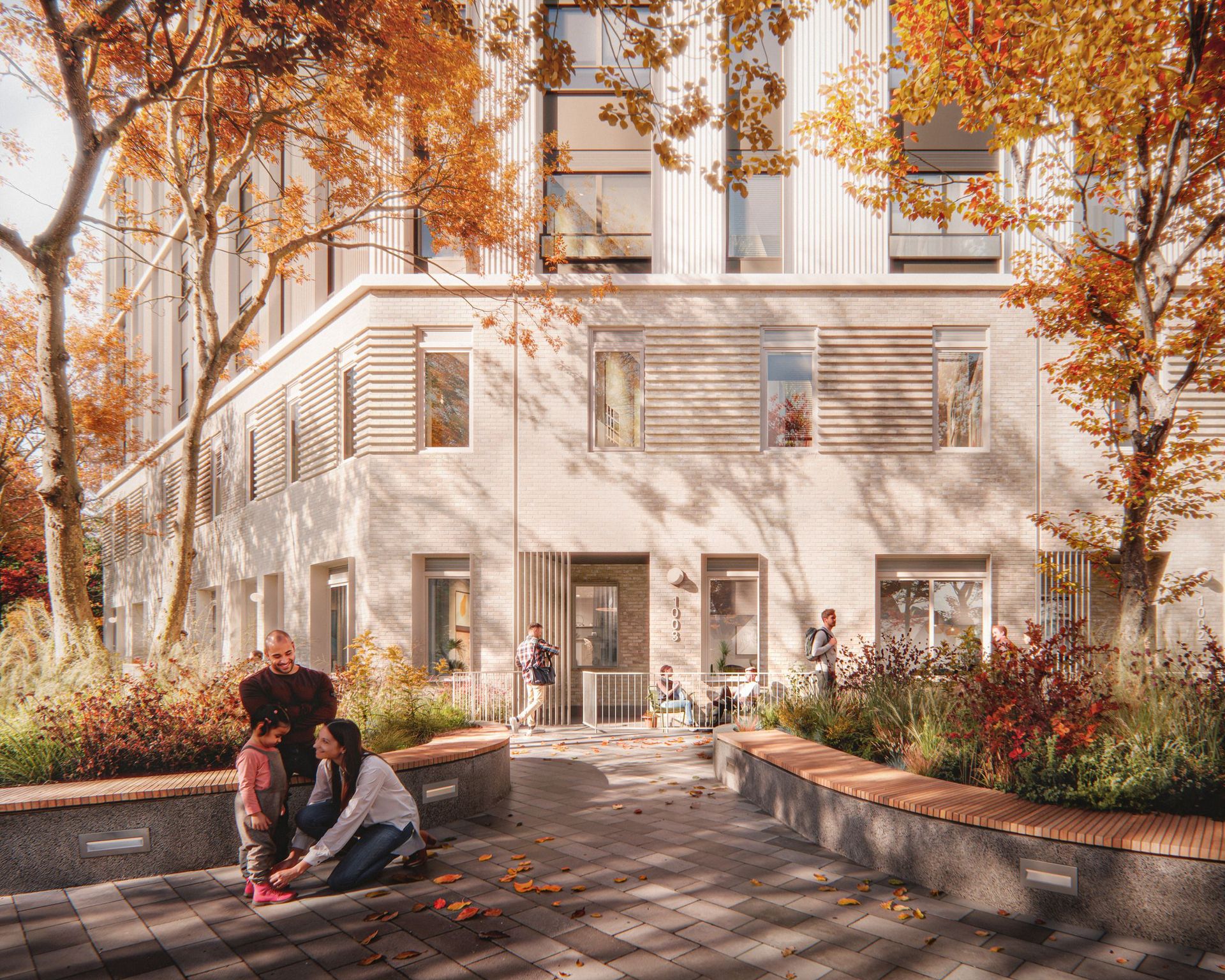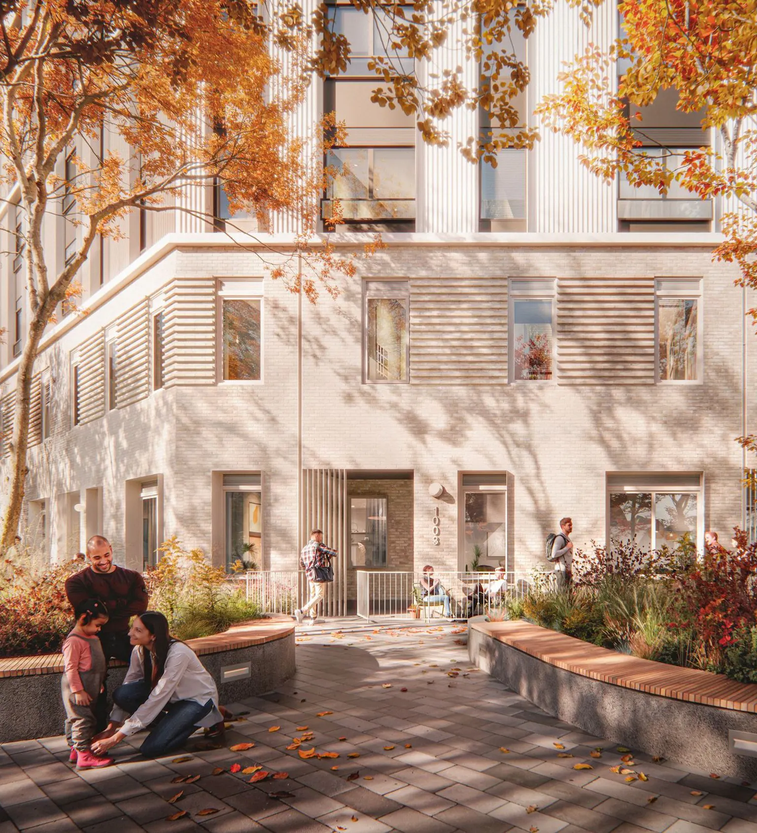 With 175 affordable units, the building targets Passive House certification and a 55% reduction in operating energy consumption. The panelised metal cladding system meets strict air tightness requirements while enabling faster construction. Twenty percent of units meet accessibility standards with universal design throughout common areas.