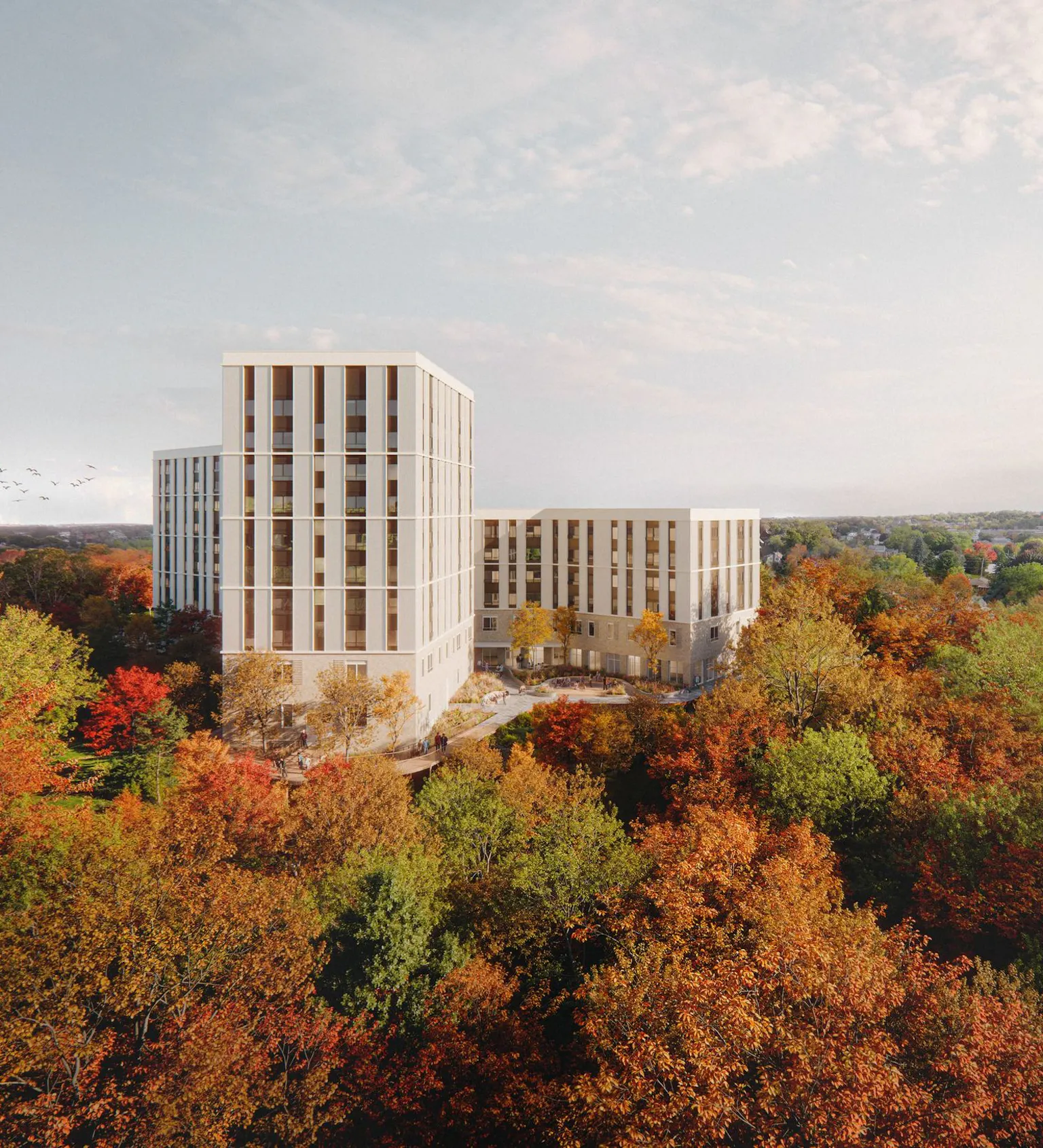 This nine-storey housing development places 246 units in direct connection with the surrounding forest. The building's unique Y-shaped form responds to the natural topography, ensuring as many units as possible enjoy visual connections to the surrounding forest canopy. A landscaped public pathway wraps the building perimeter, giving everyone access to enjoy the conservation lands while preserving the existing bird sanctuary.