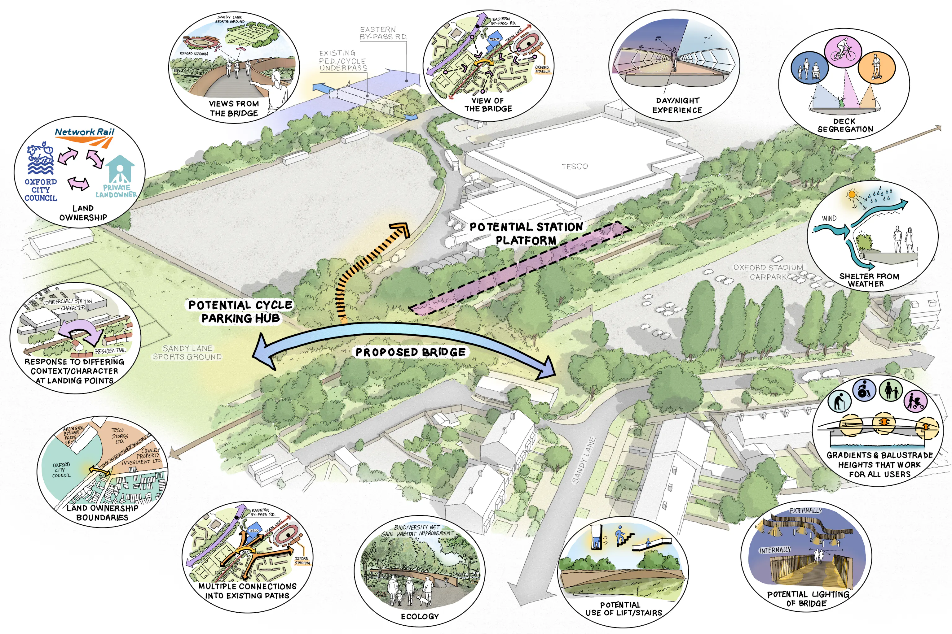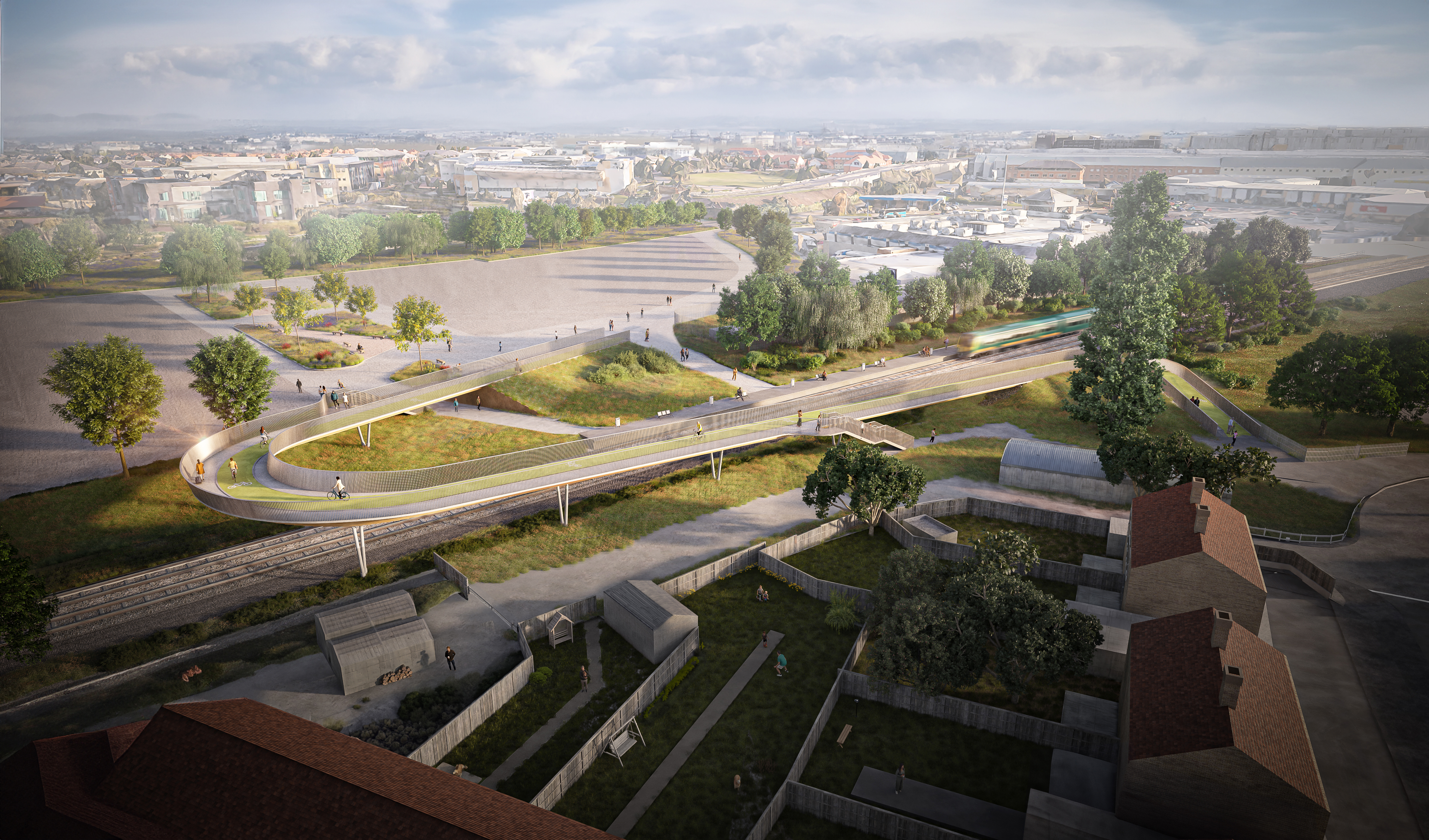 Our design for Cowley Branch Line pedestrian and cycle bridge employs innovative low-carbon solutions, with an aspiration that takes complex land ownership issues, site constraints and inclusivity aspirations into consideration resulting in an elegant curving shape.