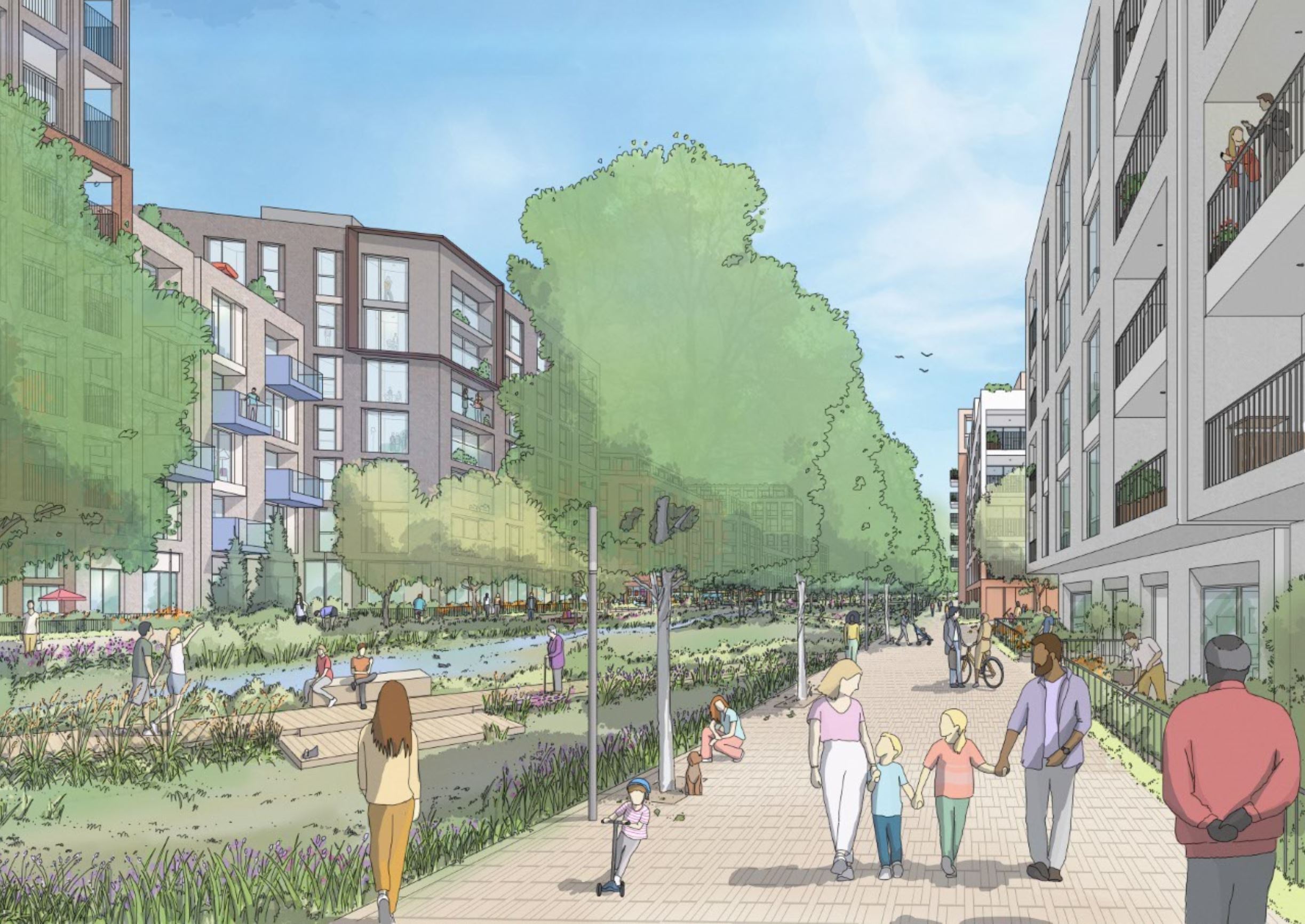 Organised into three areas - Northfleet Rise, the Station Garden and the City Park - the masterplan delivers a long-term vision for the Garden City. The new urban centre is linked to the surrounding communities, delivering a variety of homes, employment opportunities and commercially focused activity with an emphasis on health and well-being, high-quality open space, and sustainable modes of transport.