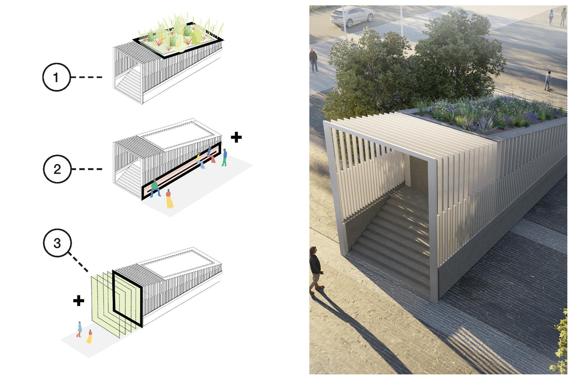 At the heart of our proposal was the desire to deliver high quality public realm that prioritises the street level pedestrian experience. We achieved this in three ways: consolidation of multiple assets to a single volume to improve pedestrian flows; a clear uniformed architecture to aid wayfinding; and the use of the asset perimeters to create a generous connection to nature and places for people to pause and relax.