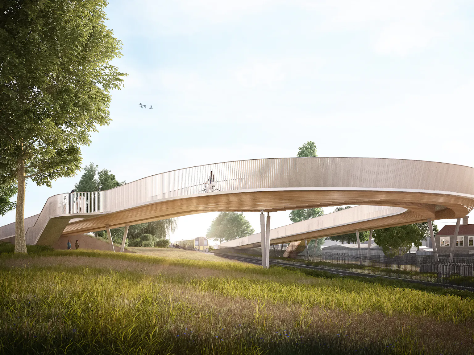 The station building form softens the interface between the rail viaduct and the surrounding rural context, with the station descending to meet a raised datum. The materiality of the design is primarily birch timber to reflect the wooded landscape. The station structure is designed to be independent of the viaduct structure allowing for a simple buildability, reducing the construction programme.