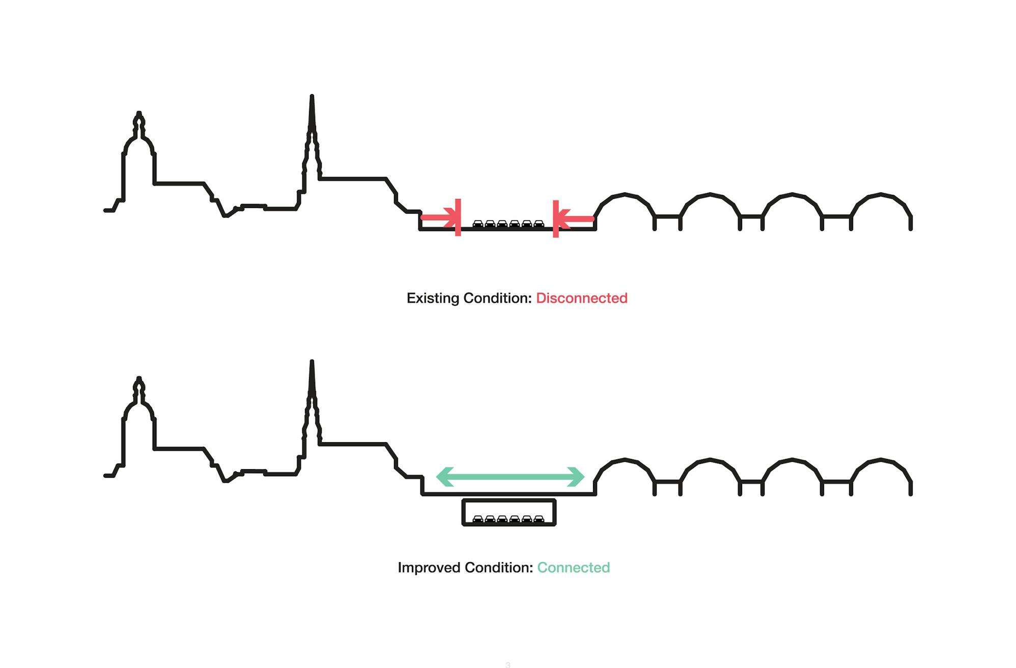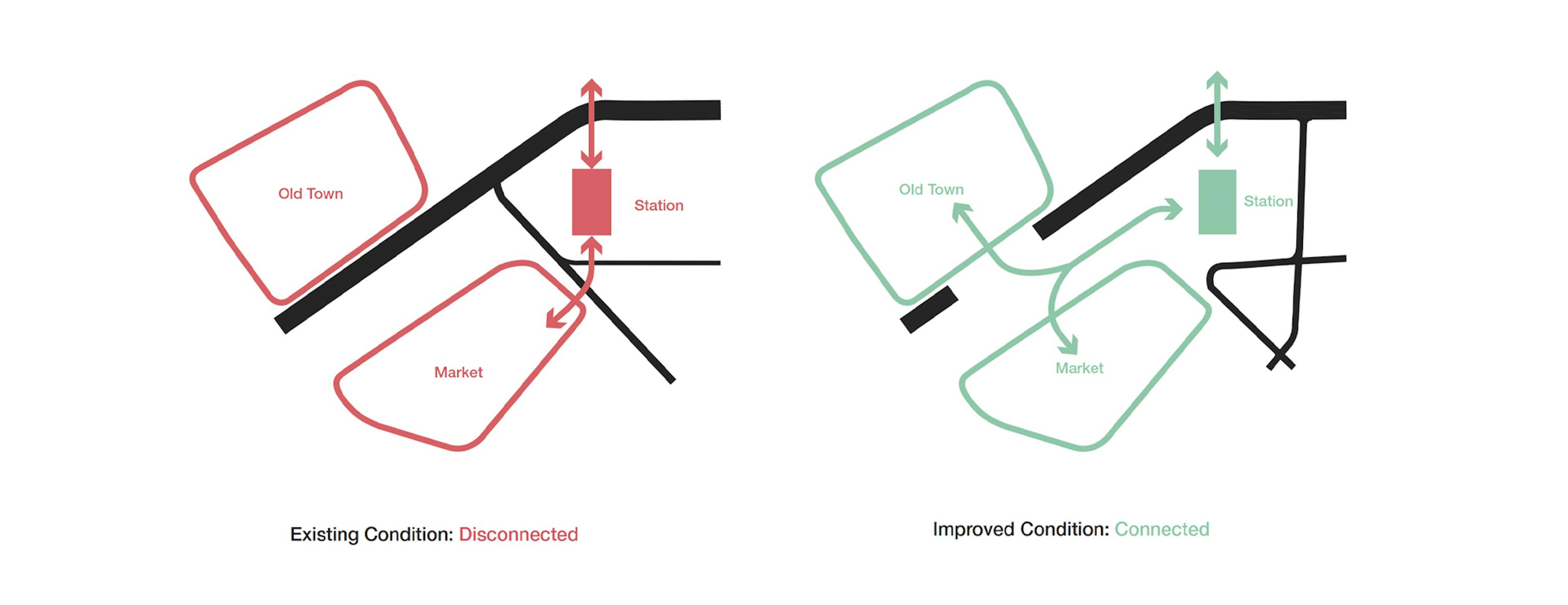 The Janvara Street Park crossing creates a place for everyone to meet; an urban mixer, where all routes feed in, from the station, waterfront, market and old town. Additional amenities and commercial spaces created beneath the railway viaduct further enhance the social inclusion. New green public spaces increase the local biodiversity and provide new public amenities.