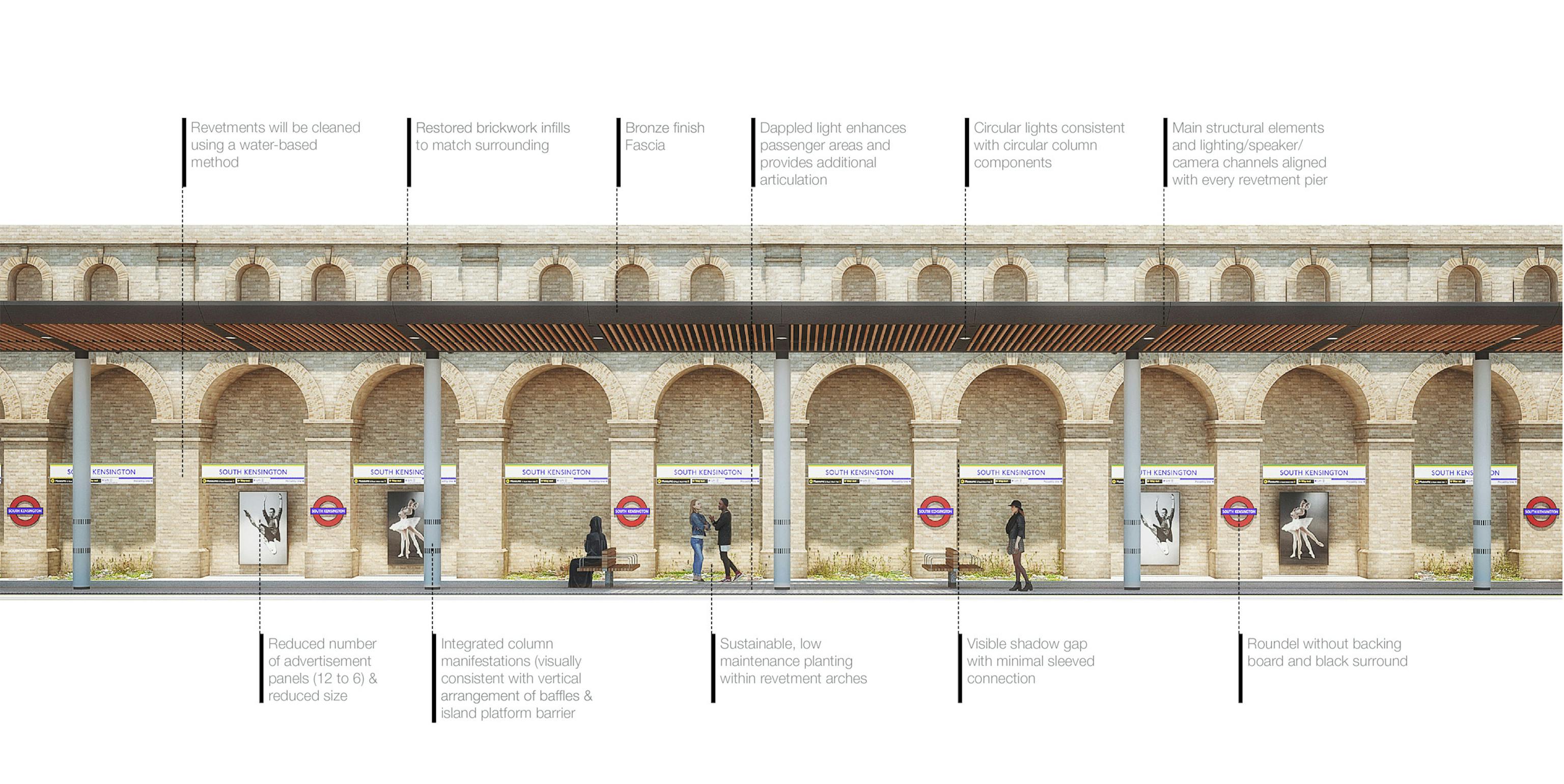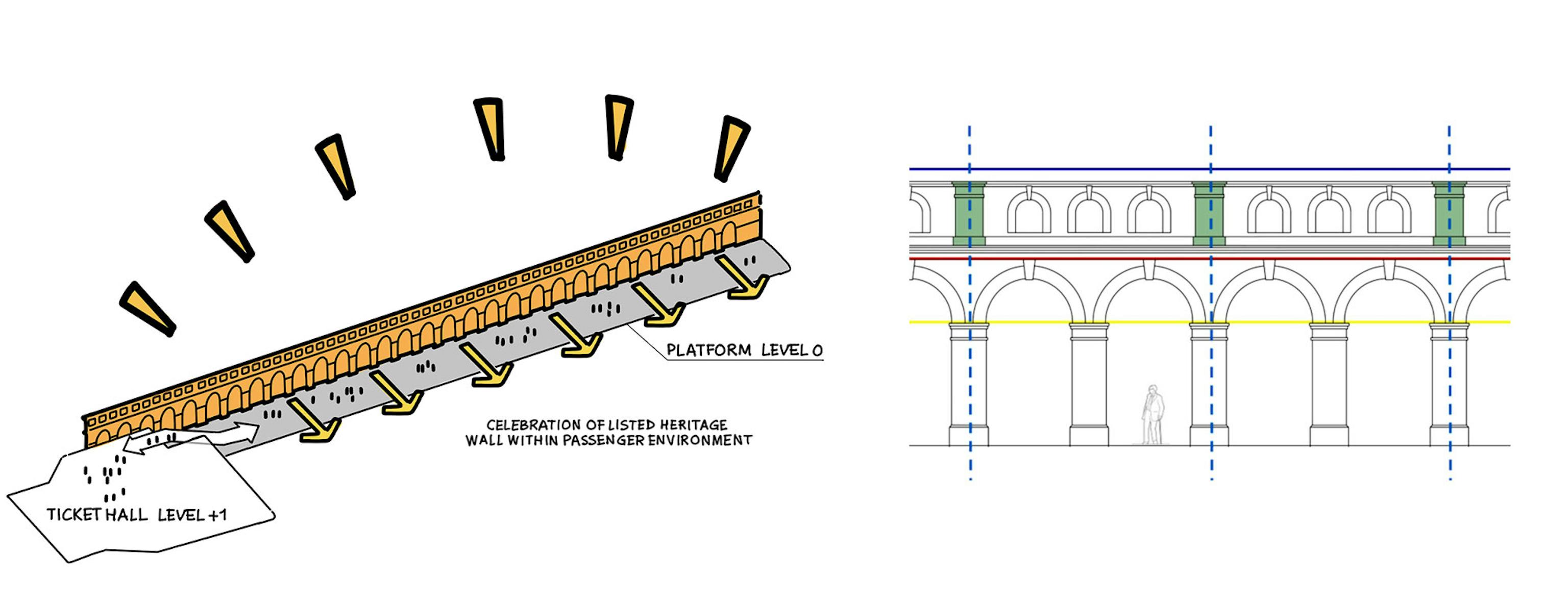 The design preserves, enhances and celebrates the station’s listed heritage assets including John Fowler’s Grade II listed revetment wall within the passenger environment. Demolition is minimised, along with the extent of new structures. Dedicated landscape bays with Sustainable Urban Drainage are incorporated in walls of the new east bound platform lowing the flood rate and reducing the transport of pollution into the water environment.