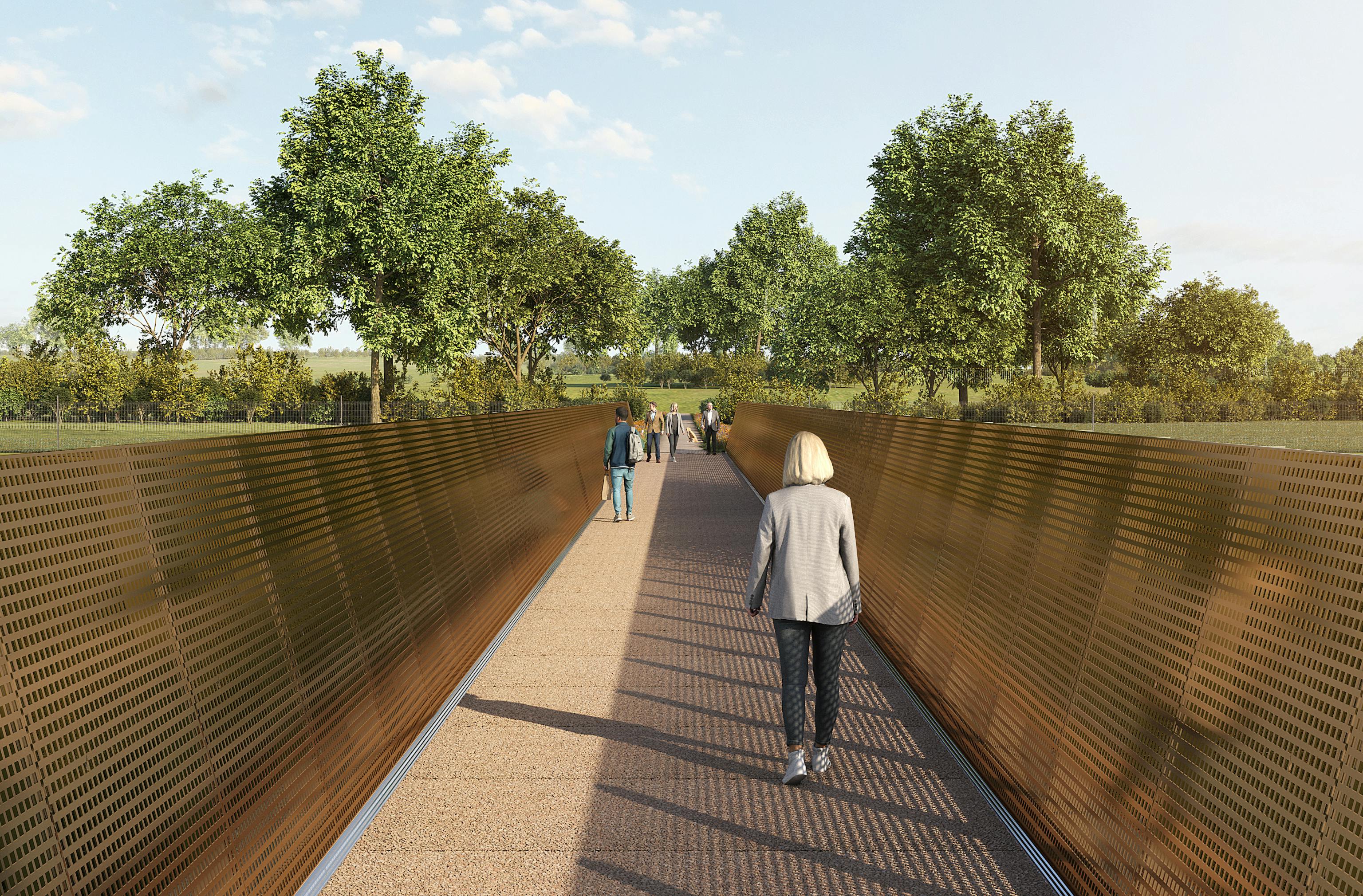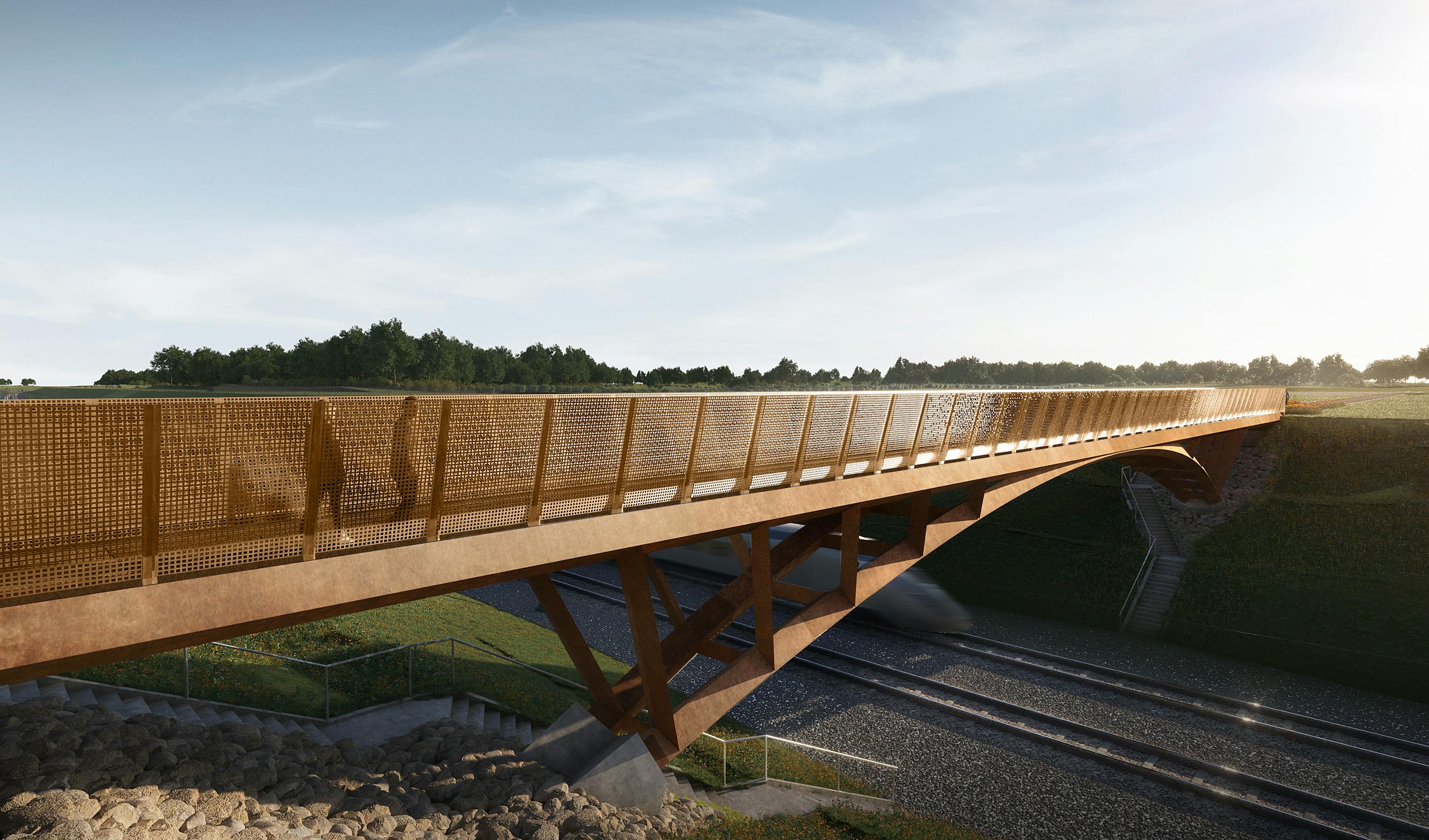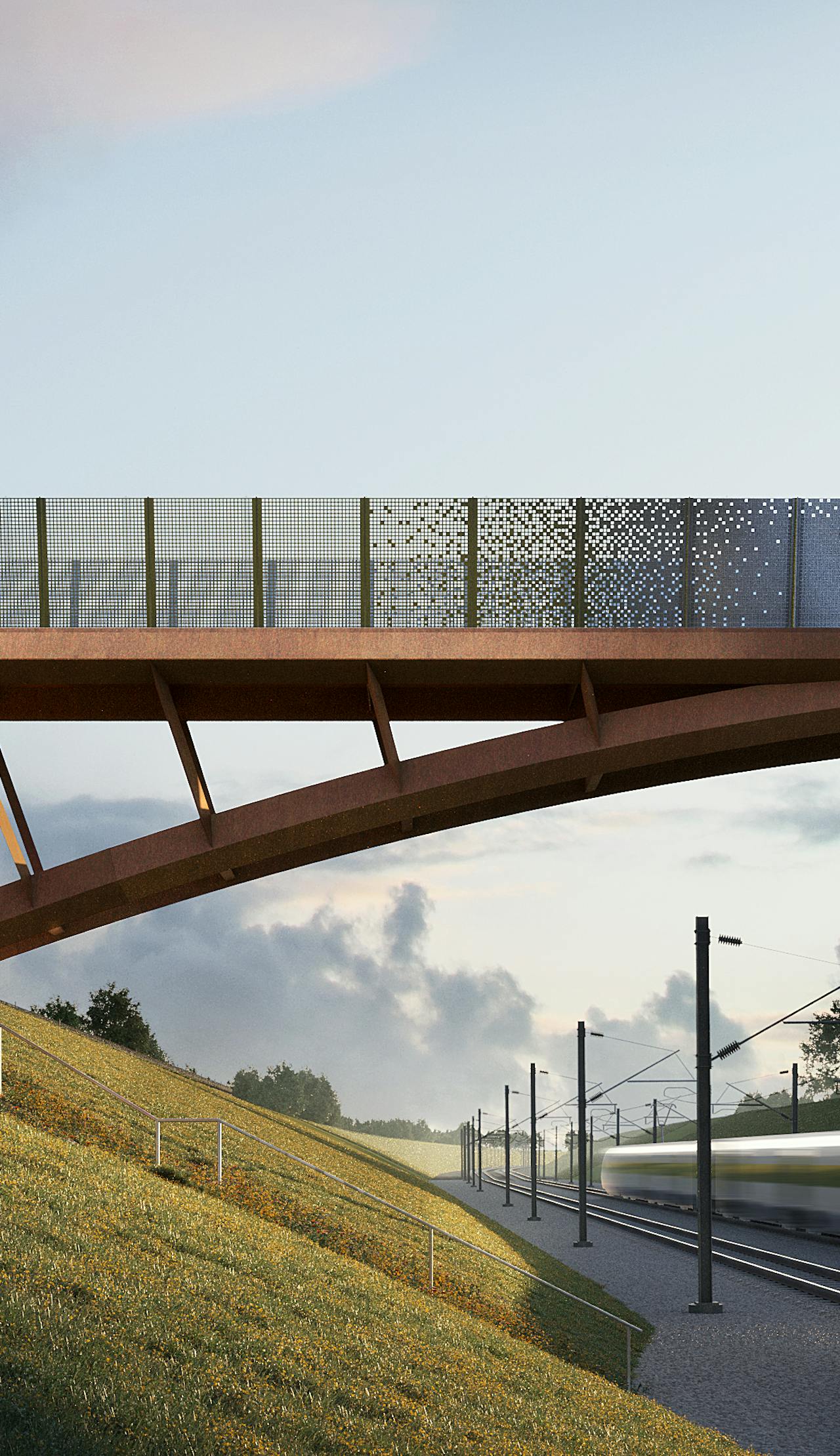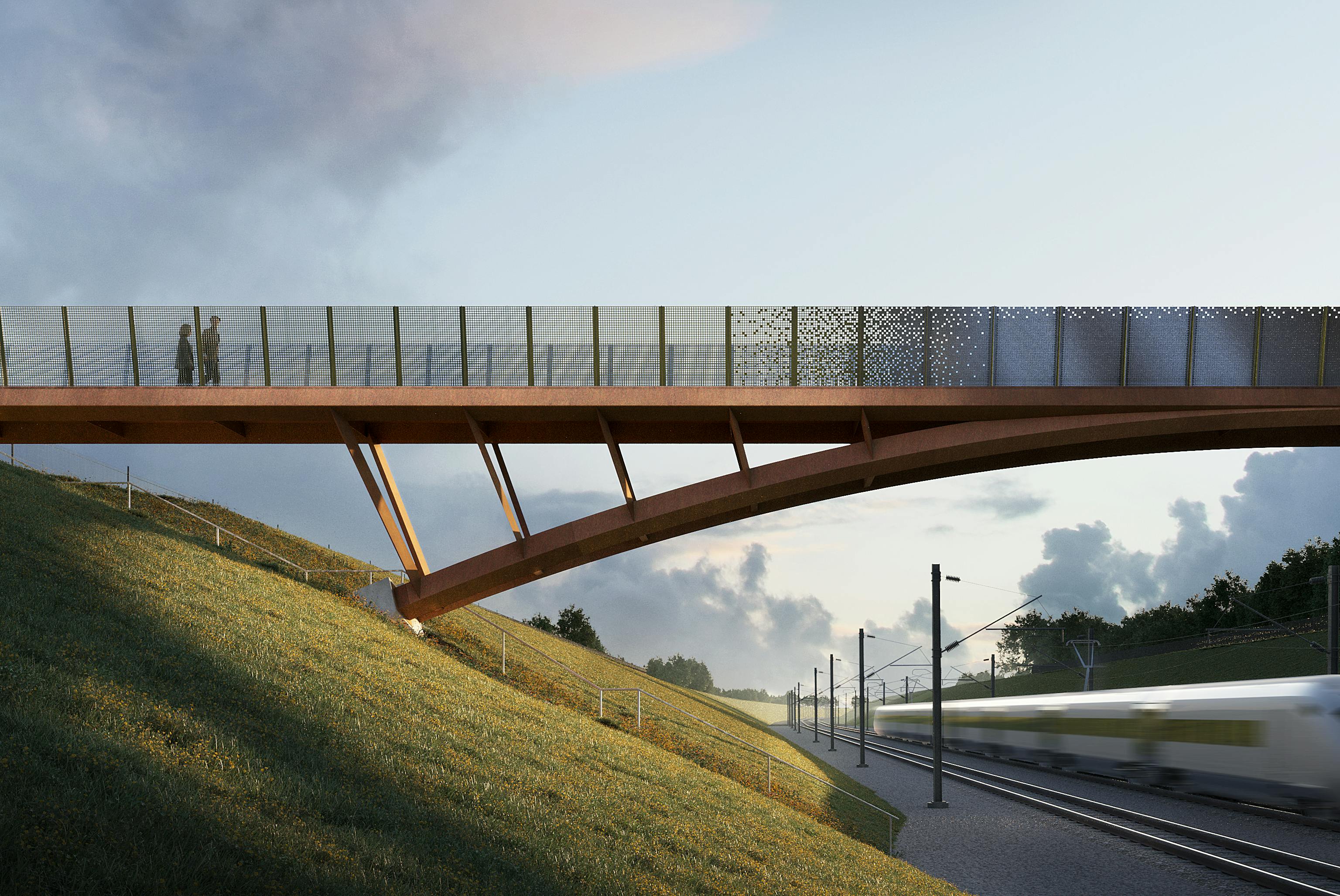 Linear infrastructure is often associated with severance, which can be environmentally, socially and economically detrimental to local communities. It is hugely important to provide routes across new and existing transport corridors, encouraging active travel and better connecting communities. Our designs for standardised rail corridor footbridges seek to address this need, providing user focused bridges which people can enjoy crossing. We achieve this with a refined design which includes variable perforation of the footbridge balustrades, maximising views wherever possible, as well as leaning the balustrades out to maximise the sense of space and openness for people crossing without the associated costs of a wider bridge deck.